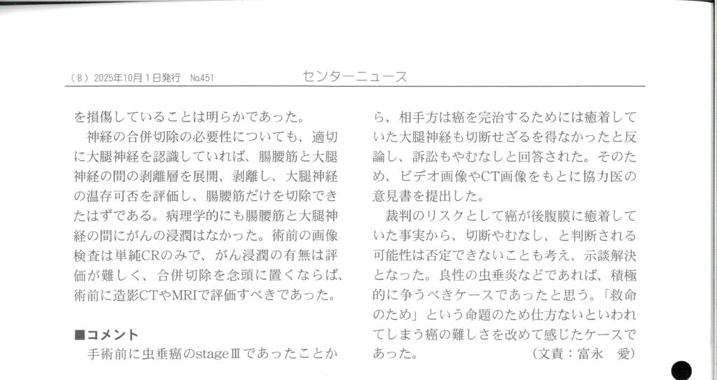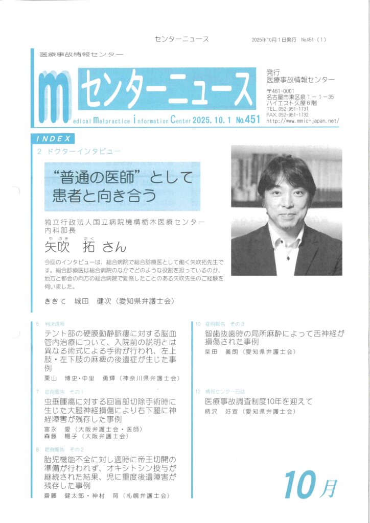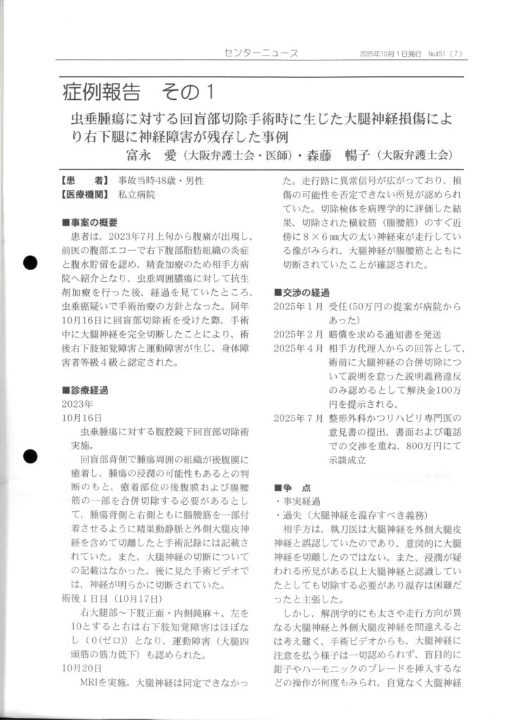 当事務所が担当した事例が、症例報告としてセンターニュース(医療事故情報センター・2025年10月1日発行 No.451)に掲載されました。