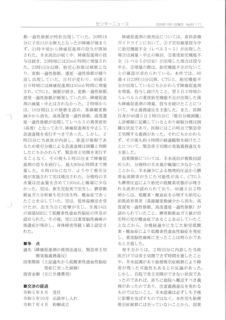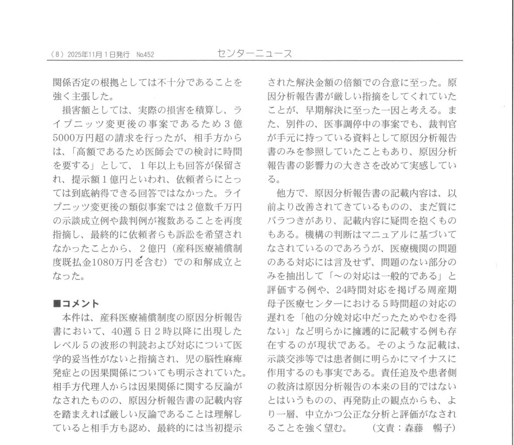 当事務所が担当した事例が、症例報告としてセンターニュース(医療事故情報センター・2025年11月1日発行 No.452)に掲載されました。