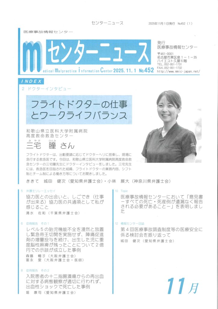 当事務所が担当した事例が、症例報告としてセンターニュース(医療事故情報センター・2025年11月1日発行 No.452)に掲載されました。